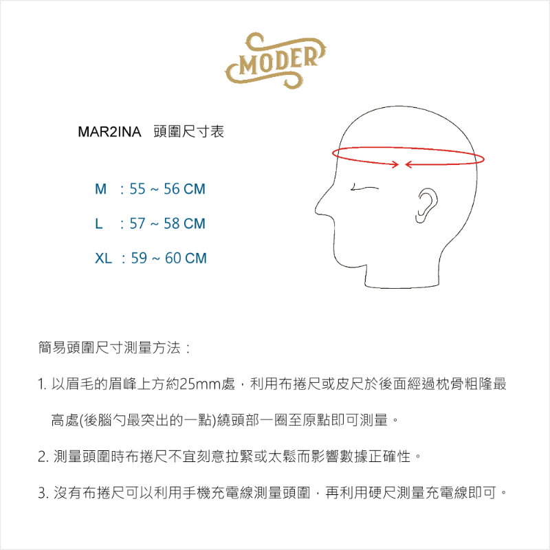 頭圍尺寸:M (55-56cm)、L (57-58cm)、XL (59-60cm),選購前請參考下列頭圍測量圖表。