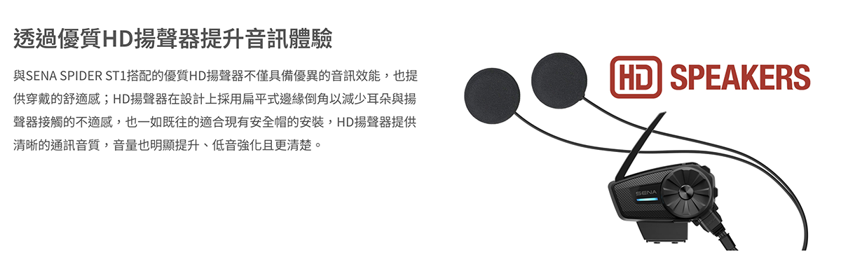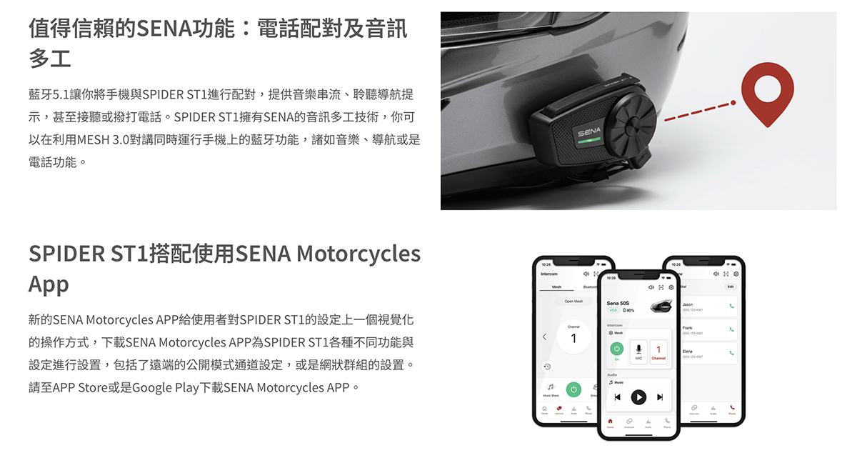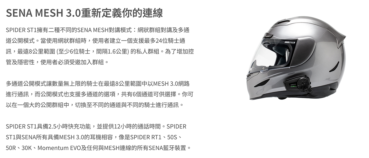 SPIDER ST1是SENA在機車通訊耳機中第一款具開創性的純MESH 2.0對講平台,SENA的優異MESH 3.0技術,如同您在旗艦機種50S及50R上所見,大幅簡化了騎士之間的通訊,現在為所有SPIDER ST1使用者提供了同樣強大的可靠性。SPIDER ST1具備超值的先進功能,包括: