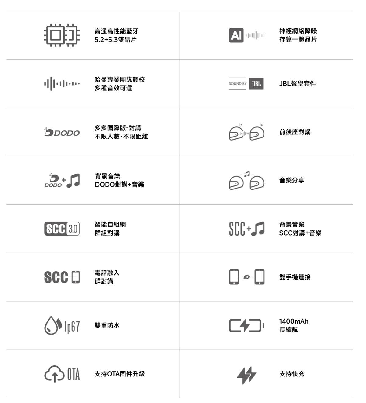 - 電池長續航,支援長時間通話、音樂、對講