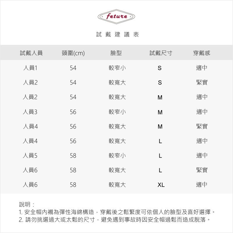 頭圍尺寸:S (53-54cm)、M (55-56cm)、L (57-58cm)、XL (59-60cm),選購前請參考以下頭圍尺寸建議圖表。